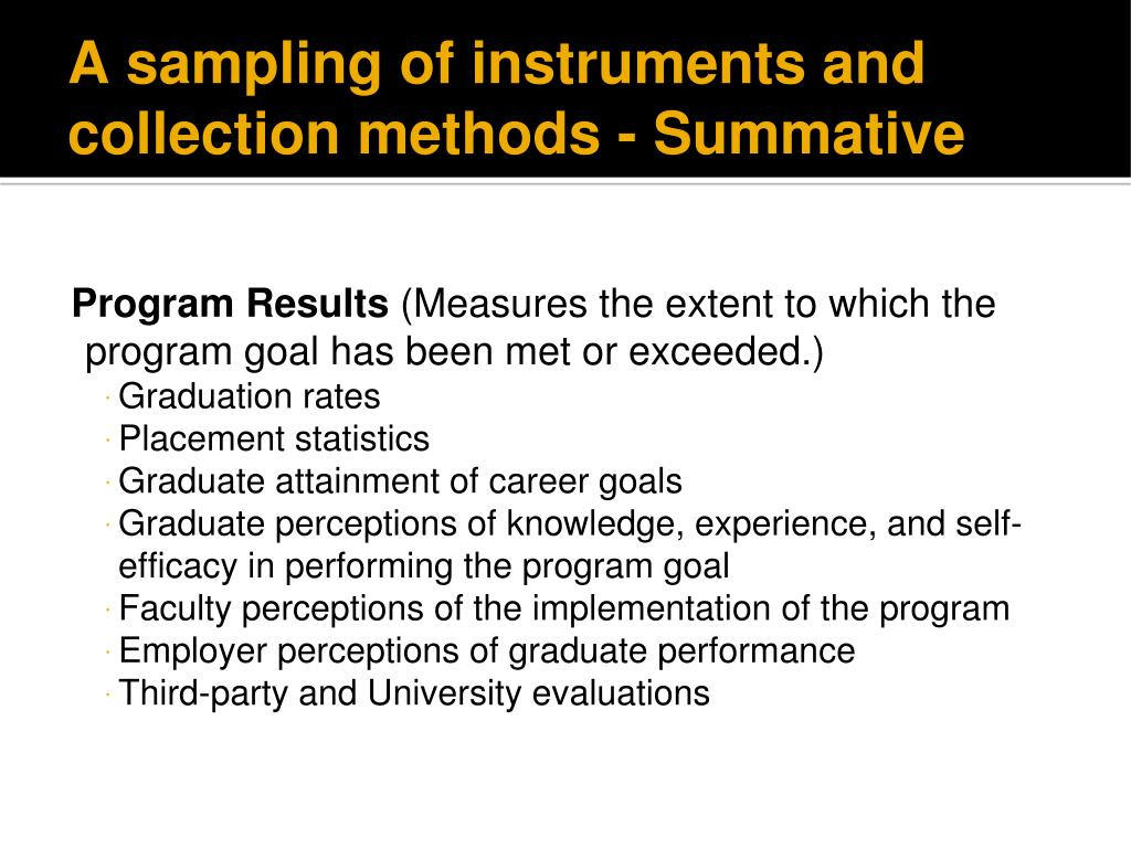 A sampling of instruments and collection methods - Summative Program Results (Measures the extent to which the program goal has been met or exceeded.) • Graduation rates • Placement statistics • Graduate attainment of career goals • Graduate perceptions of knowledge, experience, and self-efficacy in performing the program goal • Faculty perceptions of the implementation of the program • Employer perceptions of graduate performance • Third-party and University evaluations