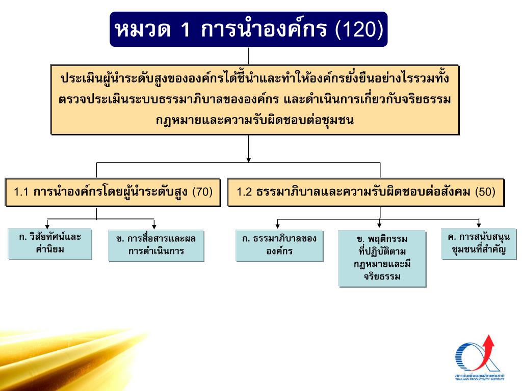 หมวด 1 การนำองค์กร (120) ประเมินผู้นำระดับสูงขององค์กรได้ชี้นำและทำให้องค์กรยั่งยืนอย่างไรรวมทั้งตรวจประเมินระบบธรรมาภิบาลขององค์กร และดำเนินการเกี่ยวกับจริยธรรม กฎหมายและความรับผิดชอบต่อชุมชน 1.1 การนำองค์กรโดยผู้นำระดับสูง (70) 1.2 ธรรมาภิบาลและความรับผิดชอบต่อสังคม (50) ค. การสนับสนุนชุมชนที่สำคัญ ก. วิสัยทัศน์และค่านิยม ก. ธรรมาภิบาลขององค์กร ข. การสื่อสารและผลการดำเนินการ ข. พฤติกรรม ที่ปฏิบัติตามกฎหมายและมีจริยธรรม