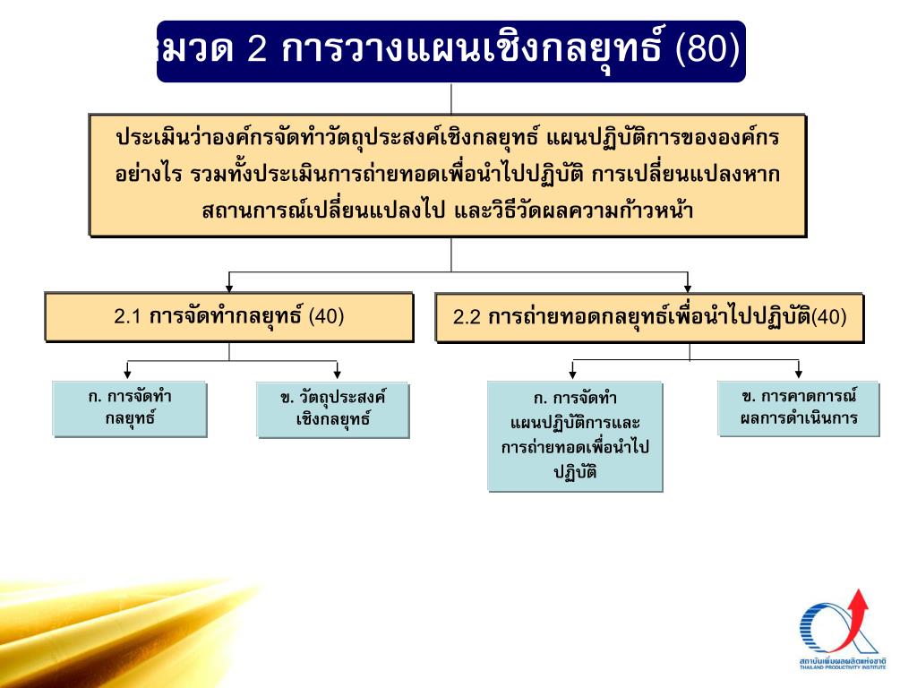 หมวด 2 การวางแผนเชิงกลยุทธ์ (80) ประเมินว่าองค์กรจัดทำวัตถุประสงค์เชิงกลยุทธ์ แผนปฏิบัติการขององค์กรอย่างไร รวมทั้งประเมินการถ่ายทอดเพื่อนำไปปฏิบัติ การเปลี่ยนแปลงหากสถานการณ์เปลี่ยนแปลงไป และวิธีวัดผลความก้าวหน้า 2.1 การจัดทำกลยุทธ์ (40) 2.2 การถ่ายทอดกลยุทธ์เพื่อนำไปปฏิบัติ(40) ก. การจัดทำแผนปฏิบัติการและการถ่ายทอดเพื่อนำไปปฏิบัติ ข. การคาดการณ์ ผลการดำเนินการ ก. การจัดทำ กลยุทธ์ ข. วัตถุประสงค์เชิงกลยุทธ์