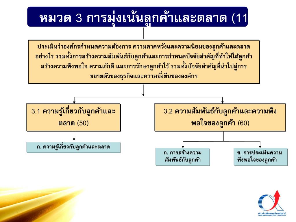 หมวด 3 การมุ่งเน้นลูกค้าและตลาด (110) ประเมินว่าองค์กรกำหนดความต้องการ ความคาดหวังและความนิยมของลูกค้าและตลาดอย่างไร รวมทั้งการสร้างความสัมพันธ์กับลูกค้าและการกำหนดปัจจัยสำคัญที่ทำให้ได้ลูกค้า สร้างความพึงพอใจ ความภักดี และการรักษาลูกค้าไว้ รวมทั้งปัจจัยสำคัญที่นำไปสู่การขยายตัวของธุรกิจและความยั่งยืนขององค์กร 3.1 ความรู้เกี่ยวกับลูกค้าและตลาด (50) 3.2 ความสัมพันธ์กับลูกค้าและความพึงพอใจของลูกค้า (60) ก. ความรู้เกี่ยวกับลูกค้าและตลาด ก. การสร้างความ สัมพันธ์กับลูกค้า ข. การประเมินความพึงพอใจของลูกค้า