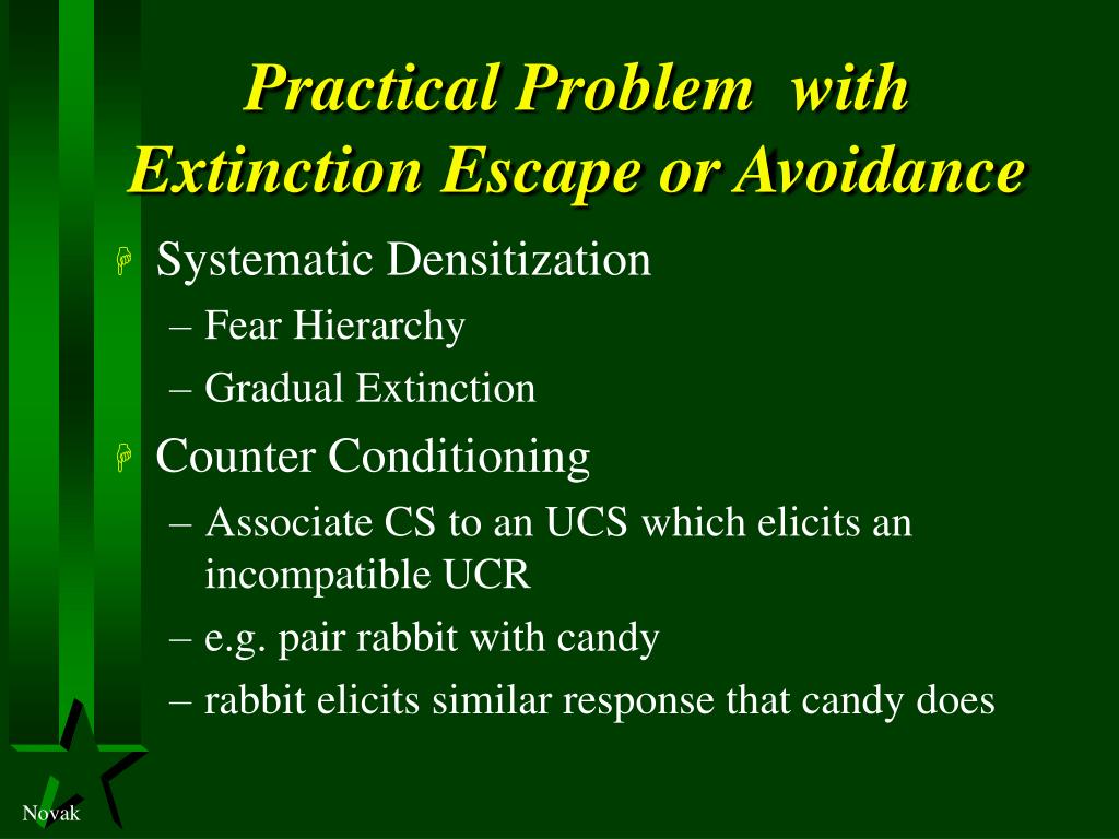 Practical Problem with Extinction Escape or Avoidance • Systematic Densitization • Fear Hierarchy • Gradual Extinction • Counter Conditioning • Associate CS to an UCS which elicits an incompatible UCR • e.g. pair rabbit with candy • rabbit elicits similar response that candy does