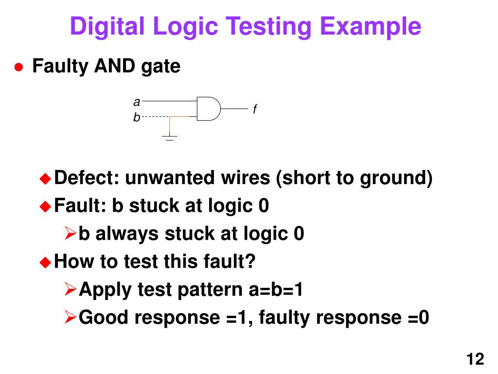 Digital Logic Testing Example • Faulty AND gate • Defect: unwanted wires (short to ground) • Fault: b stuck at logic 0 • b always stuck at logic 0 • How to test this fault? • Apply test pattern a=b=1 • Good response =1, faulty response =0 a f b