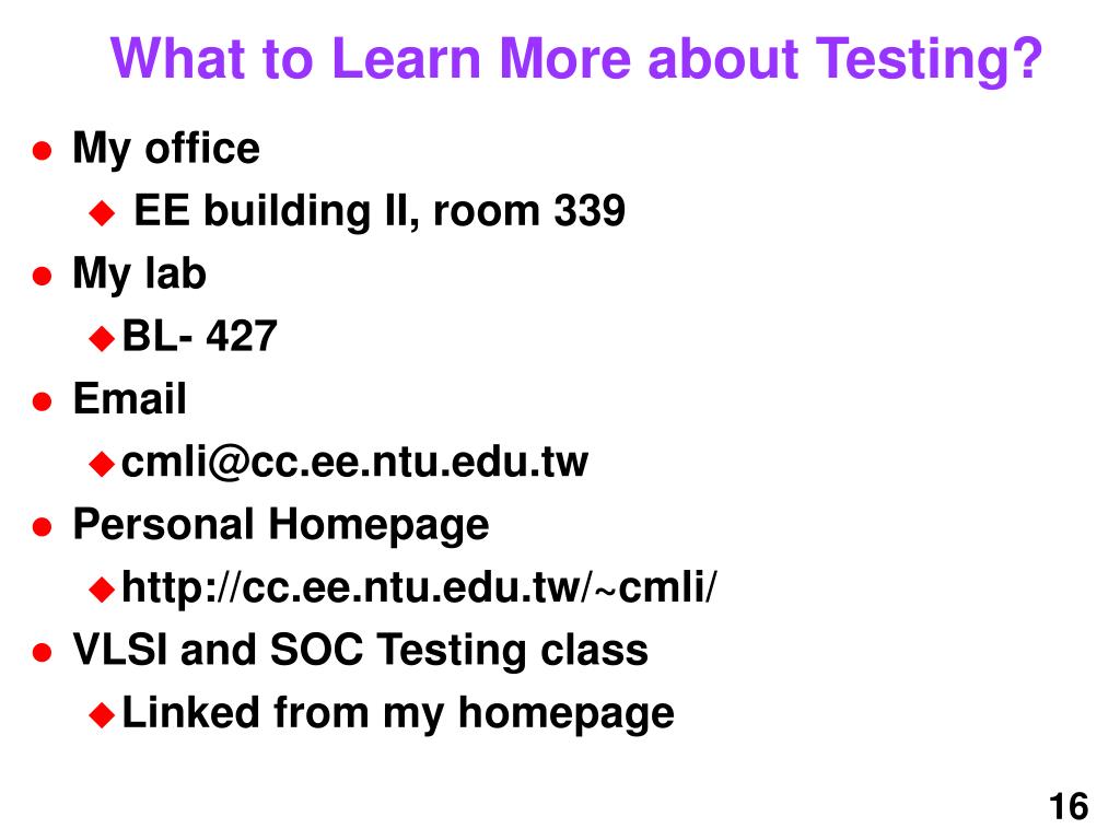 What to Learn More about Testing? • My office • EE building II, room 339 • My lab • BL- 427 • Email • cmli@cc.ee.ntu.edu.tw • Personal Homepage • http://cc.ee.ntu.edu.tw/~cmli/ • VLSI and SOC Testing class • Linked from my homepage