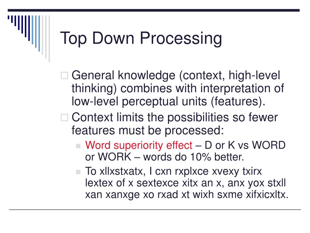 Top Down Processing • General knowledge (context, high-level thinking) combines with interpretation of low-level perceptual units (features). • Context limits the possibilities so fewer features must be processed: • Word superiority effect – D or K vs WORD or WORK – words do 10% better. • To xllxstxatx, I cxn rxplxce xvexy txirx lextex of x sextexce xitx an x, anx yox stxll xan xanxge xo rxad xt wixh sxme xifxicxltx.