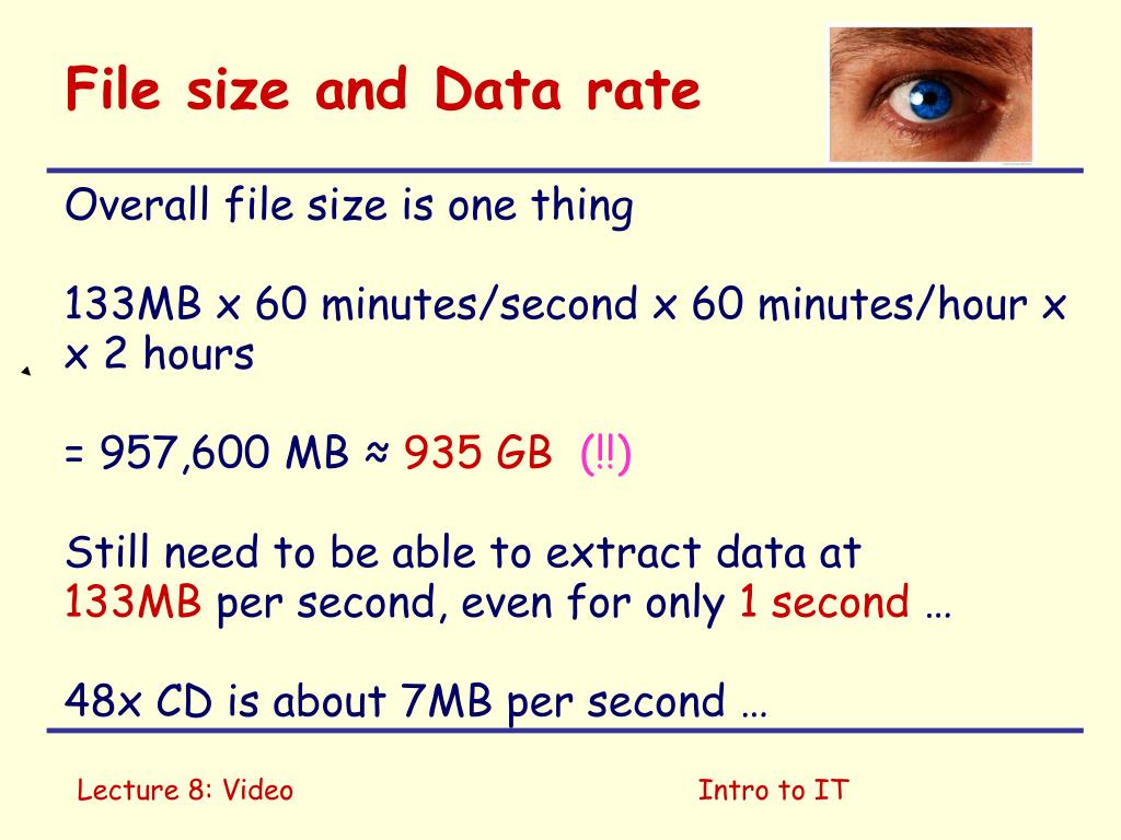 File size and Data rate Overall file size is one thing 133MB x 60 minutes/second x 60 minutes/hour x x 2 hours = 957,600 MB ≈ 935 GB(!!) Still need to be able to extract data at 133MB per second, even for only 1 second … 48x CD is about 7MB per second … Lecture 8: Video Intro to IT