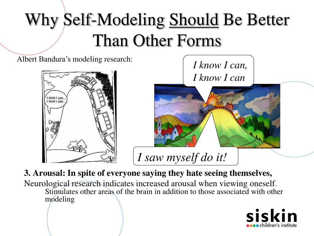 Why Self-Modeling Should Be Better Than Other Forms Albert Bandura’s modeling research: 3. Arousal: In spite of everyone saying they hate seeing themselves, Neurological research indicates increased arousal when viewing oneself. Stimulates other areas of the brain in addition to those associated with other modeling I know I can, I know I can I saw myself do it!