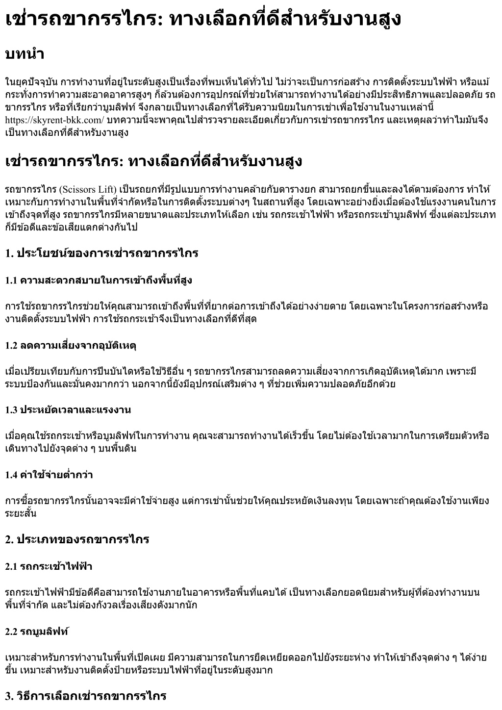 เช่ารถขากรรไกร: ทางเลือกที?ดีสําหรับงานสูง บทนํา ในยุคปัจจุบันการทํางานที?อยู่ในระดับสูงเป็นเรื?องที?พบเห็นได้ทั?วไปไม่ว่าจะเป็นการก่อสร้างการติดตั?งระบบไฟฟ้าหรือแม้ กระทั?งการทําความสะอาดอาคารสูงๆก็ล้วนต้องการอุปกรณ์ที?ช่วยให้สามารถทํางานได้อย่างมีประสิทธิภาพและปลอดภัยรถ ขากรรไกรหรือที?เรียกว่าบูมลิฟท์จึงกลายเป็นทางเลือกที?ได้รับความนิยมในการเช่าเพื?อใช้งานในงานเหล่านี? https://skyrent-bkk.com/ บทความนี?จะพาคุณไปสํารวจรายละเอียดเกี?ยวกับการเช่ารถขากรรไกรและเหตุผลว่าทําไมมันจึง เป็นทางเลือกที?ดีสําหรับงานสูง เช่ารถขากรรไกร: ทางเลือกที?ดีสําหรับงานสูง รถขากรรไกร (Scissors Lift) เป็นรถยกที?มีรูปแบบการทํางานคล้ายกับตารางยกสามารถยกขึ?นและลงได้ตามต้องการทําให้ เหมาะกับการทํางานในพื?นที?จํากัดหรือในการติดตั?งระบบต่างๆในสถานที?สูงโดยเฉพาะอย่างยิ?งเมื?อต้องใช้แรงงานคนในการ เข้าถึงจุดที?สูงรถขากรรไกรมีหลายขนาดและประเภทให้เลือกเช่นรถกระเช้าไฟฟ้าหรือรถกระเช้าบูมลิฟท์ซึ?งแต่ละประเภท ก็มีข้อดีและข้อเสียแตกต่างกันไป 1. ประโยชน์ของการเช่ารถขากรรไกร 1.1 ความสะดวกสบายในการเข้าถึงพื?นที?สูง การใช้รถขากรรไกรช่วยให้คุณสามารถเข้าถึงพื?นที?ที?ยากต่อการเข้าถึงได้อย่างง่ายดายโดยเฉพาะในโครงการก่อสร้างหรือ งานติดตั?งระบบไฟฟ้าการใช้รถกระเช้าจึงเป็นทางเลือกที?ดีที?สุด 1.2 ลดความเสี?ยงจากอุบัติเหตุ เมื?อเปรียบเทียบกับการปีนบันไดหรือใช้วิธีอื?นๆรถขากรรไกรสามารถลดความเสี?ยงจากการเกิดอุบัติเหตุได้มากเพราะมี ระบบป้องกันและมั?นคงมากกว่านอกจากนี?ยังมีอุปกรณ์เสริมต่างๆที?ช่วยเพิ?มความปลอดภัยอีกด้วย 1.3 ประหยัดเวลาและแรงงาน เมื?อคุณใช้รถกระเช้าหรือบูมลิฟท์ในการทํางานคุณจะสามารถทํางานได้เร็วขึ?นโดยไม่ต้องใช้เวลามากในการเตรียมตัวหรือ เดินทางไปยังจุดต่างๆบนพื?นดิน 1.4 ค่าใช้จ่ายตํ?ากว่า การซื?อรถขากรรไกรนั?นอาจจะมีค่าใช้จ่ายสูงแต่การเช่านั?นช่วยให้คุณประหยัดเงินลงทุนโดยเฉพาะถ้าคุณต้องใช้งานเพียง ระยะสั?น 2. ประเภทของรถขากรรไกร 2.1 รถกระเช้าไฟฟ ้ า รถกระเช้าไฟฟ้ามีข้อดีคือสามารถใช้งานภายในอาคารหรือพื?นที?แคบได้เป็นทางเลือกยอดนิยมสําหรับผู้ที?ต้องทํางานบน พื?นที?จํากัดและไม่ต้องกังวลเรื?องเสียงดังมากนัก 2.2 รถบูมลิฟท์ เหมาะสําหรับการทํางานในพื?นที?เปิดเผยมีความสามารถในการยืดเหยียดออกไปยังระยะห่างทําให้เข้าถึงจุดต่างๆได้ง่าย ขึ?นเหมาะสําหรับงานติดตั?งป้ายหรือระบบไฟฟ้าที?อยู่ในระดับสูงมาก 3. วิธีการเลือกเช่ารถขากรรไกร