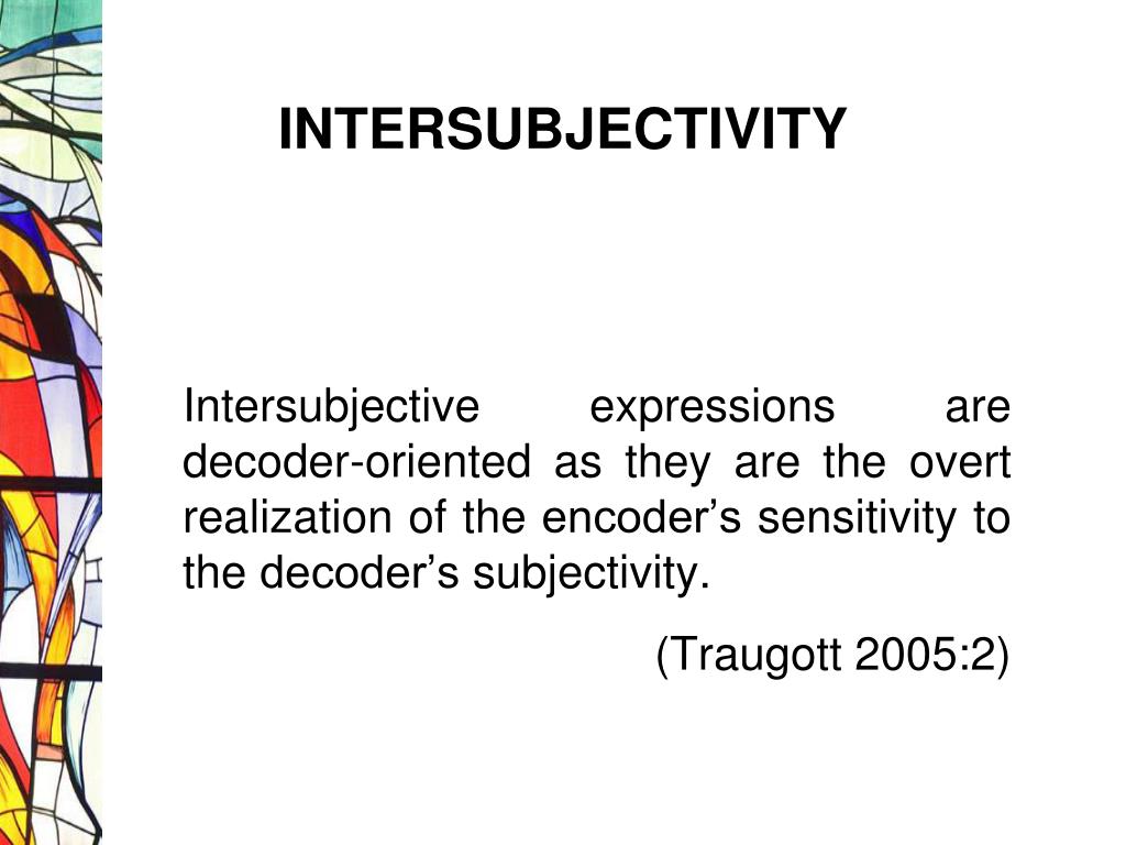 INTERSUBJECTIVITY Intersubjective expressions are decoder-oriented as they are the overt realization of the encoder’s sensitivity to the decoder’s subjectivity. (Traugott 2005:2)