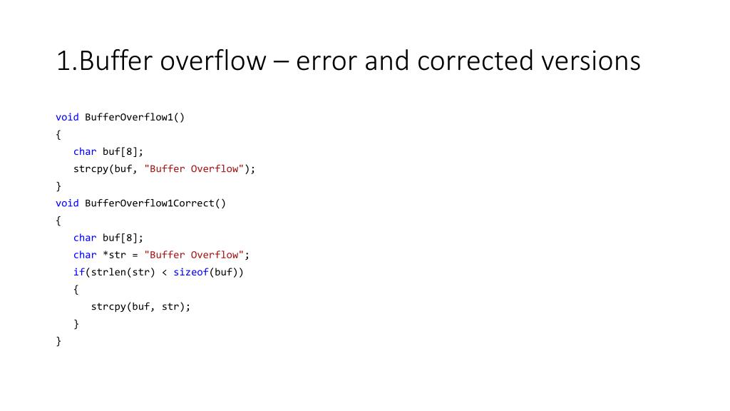 1.Buffer overflow – error and corrected versions void BufferOverflow1() { charbuf[8]; strcpy(buf, "Buffer Overflow"); } void BufferOverflow1Correct() { charbuf[8]; char *str = "Buffer Overflow"; if(strlen(str) < sizeof(buf)) { strcpy(buf, str); } }