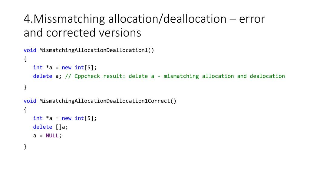4.Missmatching allocation/deallocation – error and corrected versions void MismatchingAllocationDeallocation1() { int *a = newint[5]; delete a; // Cppcheck result: delete a - mismatching allocation and dealocation } void MismatchingAllocationDeallocation1Correct() { int *a = newint[5]; delete []a; a = NULL; }