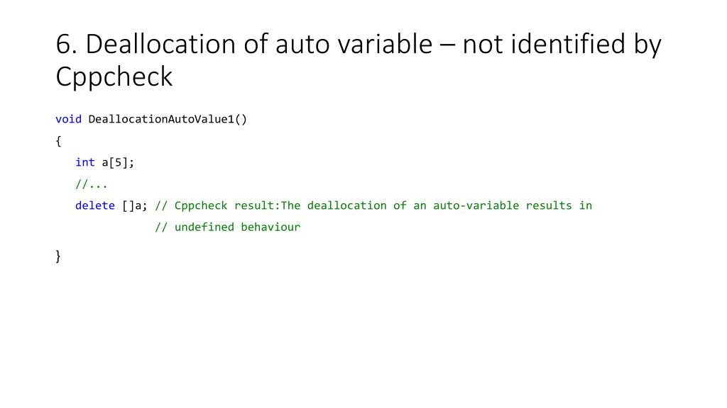 6. Deallocation of auto variable – not identified by Cppcheck void DeallocationAutoValue1() { int a[5]; //... delete []a; // Cppcheckresult:Thedeallocation of an auto-variable results in // undefined behaviour }