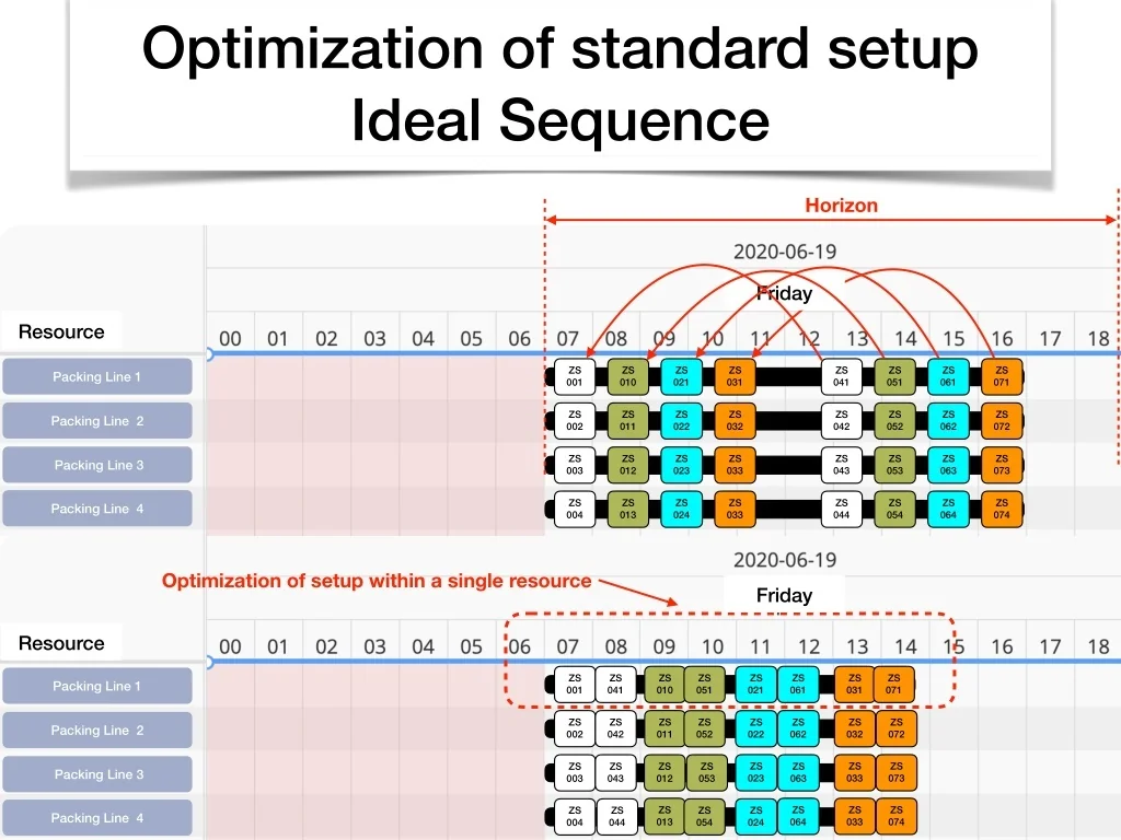 Optimization of standard setup Ideal Sequence Horizon Friday Resource ZS 001 ZS 010 ZS 021 ZS 031 ZS 041 ZS 051 ZS 061 ZS 071 Packing Line 1 ZS 002 ZS 011 ZS 022 ZS 032 ZS 042 ZS 052 ZS 062 ZS 072 Packing Line 2 ZS 003 ZS 012 ZS 023 ZS 033 ZS 043 ZS 053 ZS 063 ZS 073 Packing Line 3 ZS 004 ZS 013 ZS 024 ZS 033 ZS 044 ZS 054 ZS 064 ZS 074 Packing Line 4 Optimization of setup within a single resource Friday Resource ZS 001 ZS 041 ZS 010 ZS 051 ZS 021 ZS 061 ZS 031 ZS 071 Packing Line 1 ZS 002 ZS 042 ZS 011 ZS 062 ZS 072 ZS 052 ZS 022 ZS 032 Packing Line 2 ZS 023 ZS 033 ZS 073 ZS 003 ZS 043 ZS 012 ZS 053 ZS 063 Packing Line 3 ZS 013 ZS 064 ZS 033 ZS 074 ZS 004 ZS 044 ZS 054 ZS 024 Packing Line 4