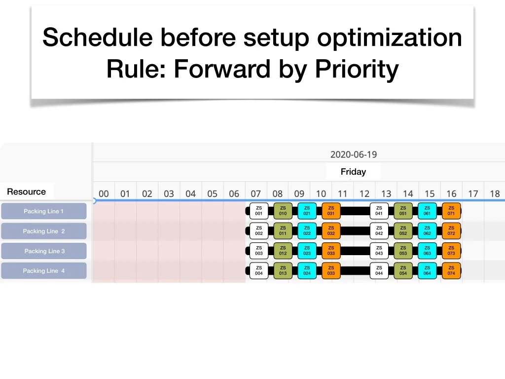 Schedule before setup optimization Rule: Forward by Priority Friday Resource ZS 001 ZS 010 ZS 021 ZS 031 ZS 041 ZS 051 ZS 061 ZS 071 Packing Line 1 ZS 002 ZS 011 ZS 022 ZS 032 ZS 042 ZS 052 ZS 062 ZS 072 Packing Line 2 ZS 003 ZS 012 ZS 023 ZS 033 ZS 043 ZS 053 ZS 063 ZS 073 Packing Line 3 ZS 004 ZS 013 ZS 024 ZS 033 ZS 044 ZS 054 ZS 064 ZS 074 Packing Line 4