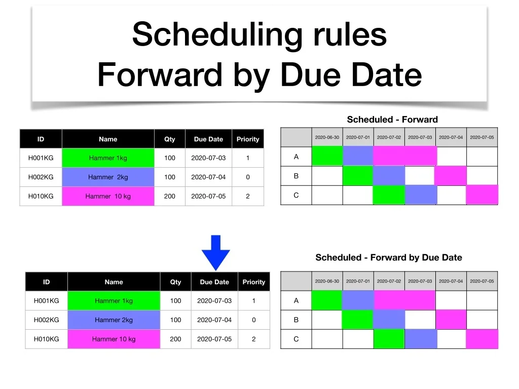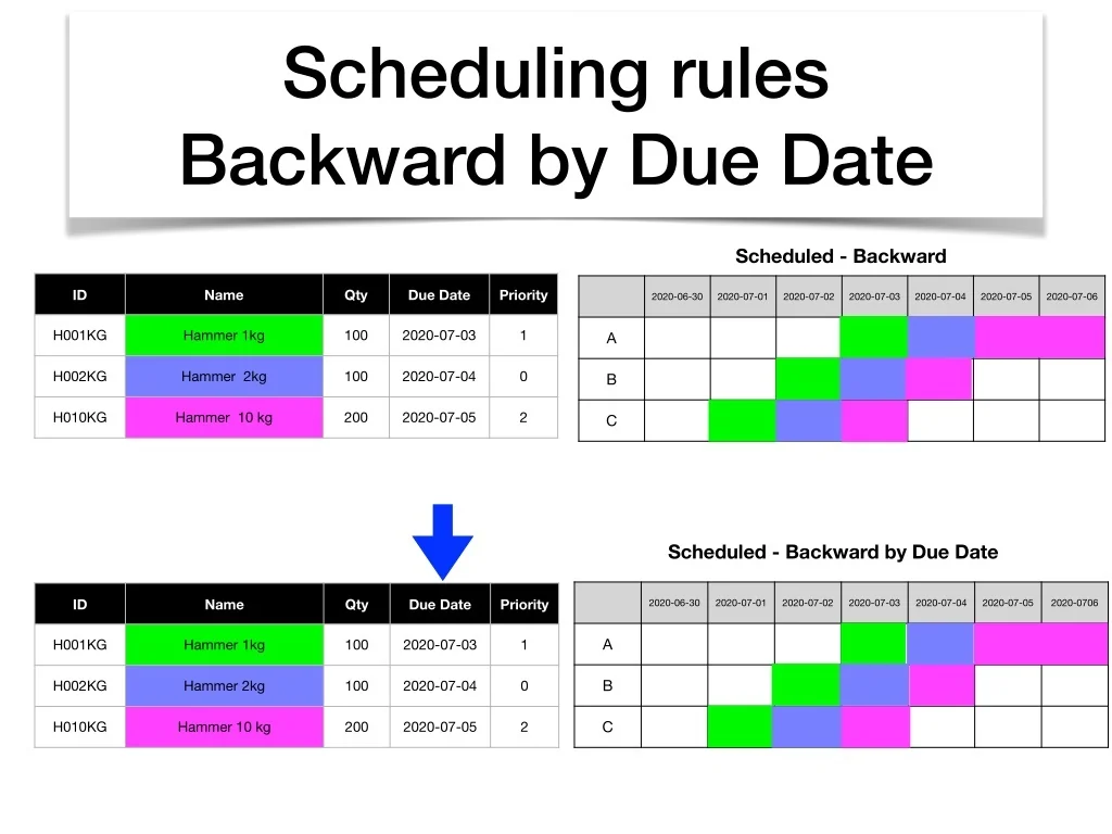 Scheduling rules Backward by Due Date Scheduled - Backward ID Name Qty Due Date Priority 2020-06-30 2020-07-01 2020-07-02 2020-07-03 2020-07-04 2020-07-05 2020-07-06 H001KG Hammer 1kg 100 2020-07-03 1 A H002KG Hammer 2kg 100 2020-07-04 0 B H010KG Hammer 10 kg 200 2020-07-05 2 C Scheduled - Backward by Due Date ID Name Qty Due Date Priority 2020-06-30 2020-07-01 2020-07-02 2020-07-03 2020-07-04 2020-07-05 2020-0706 A H001KG Hammer 1kg 100 2020-07-03 1 B H002KG Hammer 2kg 100 2020-07-04 0 C H010KG Hammer 10 kg 200 2020-07-05 2