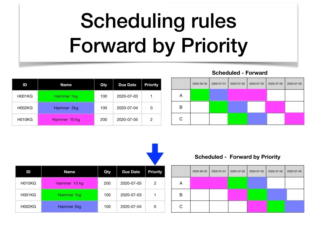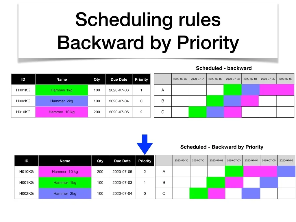 Scheduling rules Backward by Priority Scheduled - backward ID Name Qty Due Date Priority 2020-06-30 2020-07-01 2020-07-02 2020-07-03 2020-07-04 2020-07-05 2020-07-06 A H001KG Hammer 1kg 100 2020-07-03 1 B H002KG Hammer 2kg 100 2020-07-04 0 C H010KG Hammer 10 kg 200 2020-07-05 2 Scheduled - Backward by Priority ID Name Qty Due Date Priority 2020-06-30 2020-07-01 2020-07-02 2020-07-03 2020-07-04 2020-07-05 2020-07-06 A H010KG Hammer 10 kg 200 2020-07-05 2 B H001KG Hammer 1kg 100 2020-07-03 1 C H002KG Hammer 2kg 100 2020-07-04 0