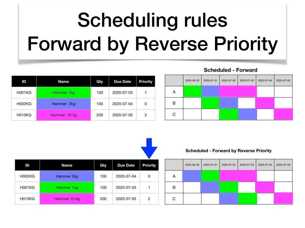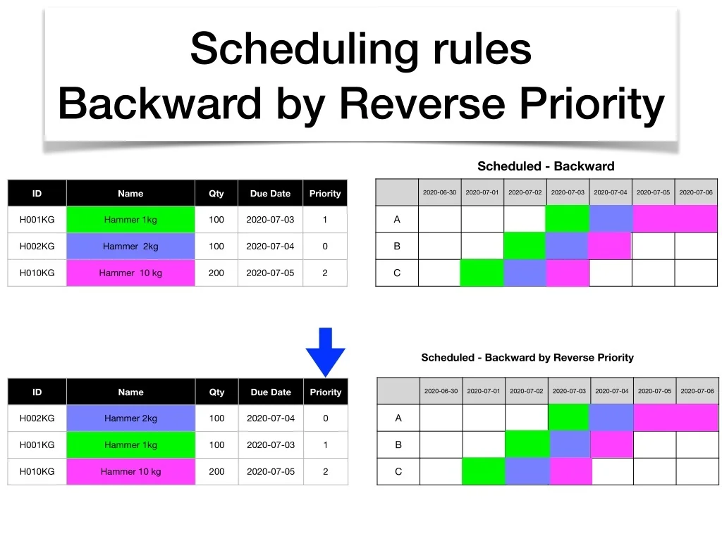 Scheduling rules Backward by Reverse Priority Scheduled - Backward ID Name Qty Due Date Priority 2020-06-30 2020-07-01 2020-07-02 2020-07-03 2020-07-04 2020-07-05 2020-07-06 A H001KG Hammer 1kg 100 2020-07-03 1 B H002KG Hammer 2kg 100 2020-07-04 0 C H010KG Hammer 10 kg 200 2020-07-05 2 Scheduled - Backward by Reverse Priority ID Name Qty Due Date Priority 2020-06-30 2020-07-01 2020-07-02 2020-07-03 2020-07-04 2020-07-05 2020-07-06 A H002KG Hammer 2kg 100 2020-07-04 0 B H001KG Hammer 1kg 100 2020-07-03 1 C H010KG Hammer 10 kg 200 2020-07-05 2