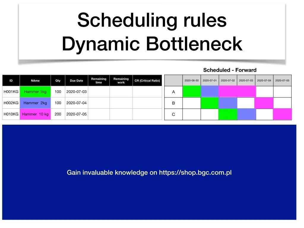 Scheduling rules Dynamic Bottleneck Scheduled - Forward Remaining time Remaining work ID NAme Qty Due Date CR (Critical Ratio) 2020-06-30 2020-07-01 2020-07-02 2020-07-03 2020-07-04 2020-07-05 H001KG Hammer 1kg 100 2020-07-03 A H002KG Hammer 2kg 100 2020-07-04 B H010KG Hammer 10 kg 200 2020-07-05 C Gain invaluable knowledge on https://shop.bgc.com.pl