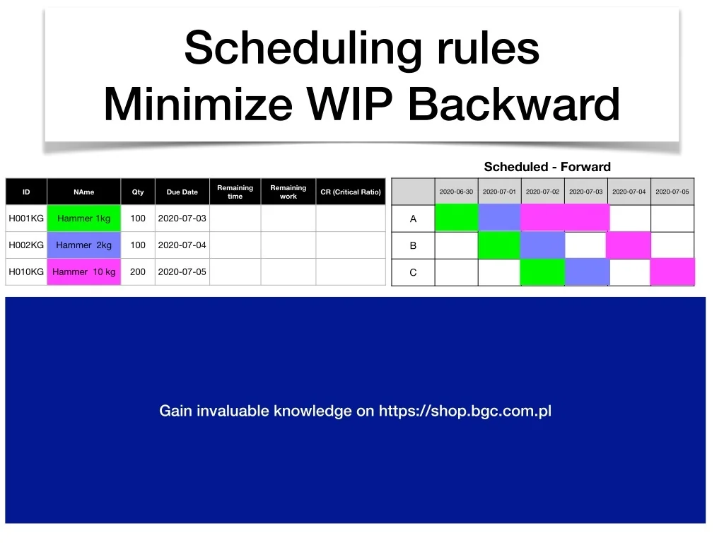 Scheduling rules Minimize WIP Backward Scheduled - Forward Remaining time Remaining work ID NAme Qty Due Date CR (Critical Ratio) 2020-06-30 2020-07-01 2020-07-02 2020-07-03 2020-07-04 2020-07-05 H001KG Hammer 1kg 100 2020-07-03 A H002KG Hammer 2kg 100 2020-07-04 B H010KG Hammer 10 kg 200 2020-07-05 C Gain invaluable knowledge on https://shop.bgc.com.pl