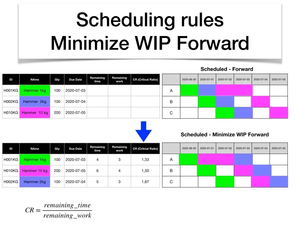 Scheduling rules Minimize WIP Forward Scheduled - Forward Remaining time Remaining work ID NAme Qty Due Date CR (Critical Ratio) 2020-06-30 2020-07-01 2020-07-02 2020-07-03 2020-07-04 2020-07-05 H001KG Hammer 1kg 100 2020-07-03 A H002KG Hammer 2kg 100 2020-07-04 B H010KG Hammer 10 kg 200 2020-07-05 C Scheduled - Minimize WIP Forward Remaining time Remaining work 2020-06-30 2020-07-01 2020-07-02 2020-07-03 2020-07-04 2020-07-05 ID NAme Qty Due Date CR (Critical Ratio) A H001KG Hammer 1kg 100 2020-07-03 4 3 1,33 B H010KG Hammer 10 kg 200 2020-07-05 6 4 1,50 C H002KG Hammer 2kg 100 2020-07-04 5 3 1,67 CR =remaining_time remaining_work