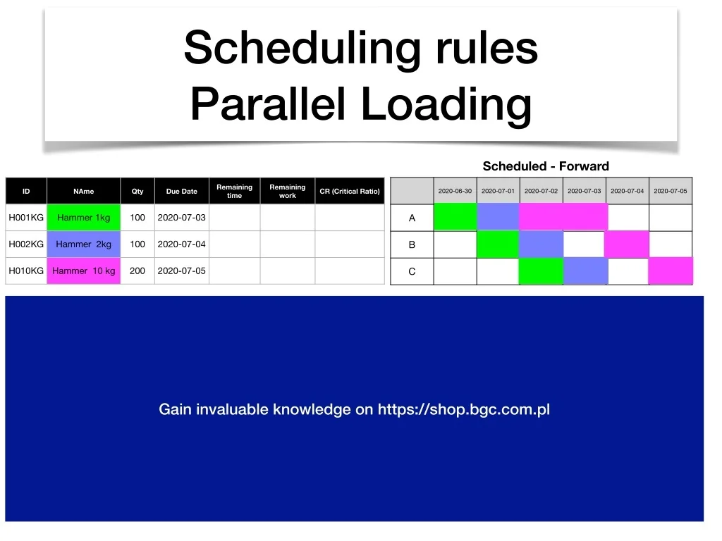 Scheduling rules Parallel Loading Scheduled - Forward Remaining time Remaining work ID NAme Qty Due Date CR (Critical Ratio) 2020-06-30 2020-07-01 2020-07-02 2020-07-03 2020-07-04 2020-07-05 H001KG Hammer 1kg 100 2020-07-03 A H002KG Hammer 2kg 100 2020-07-04 B H010KG Hammer 10 kg 200 2020-07-05 C Gain invaluable knowledge on https://shop.bgc.com.pl