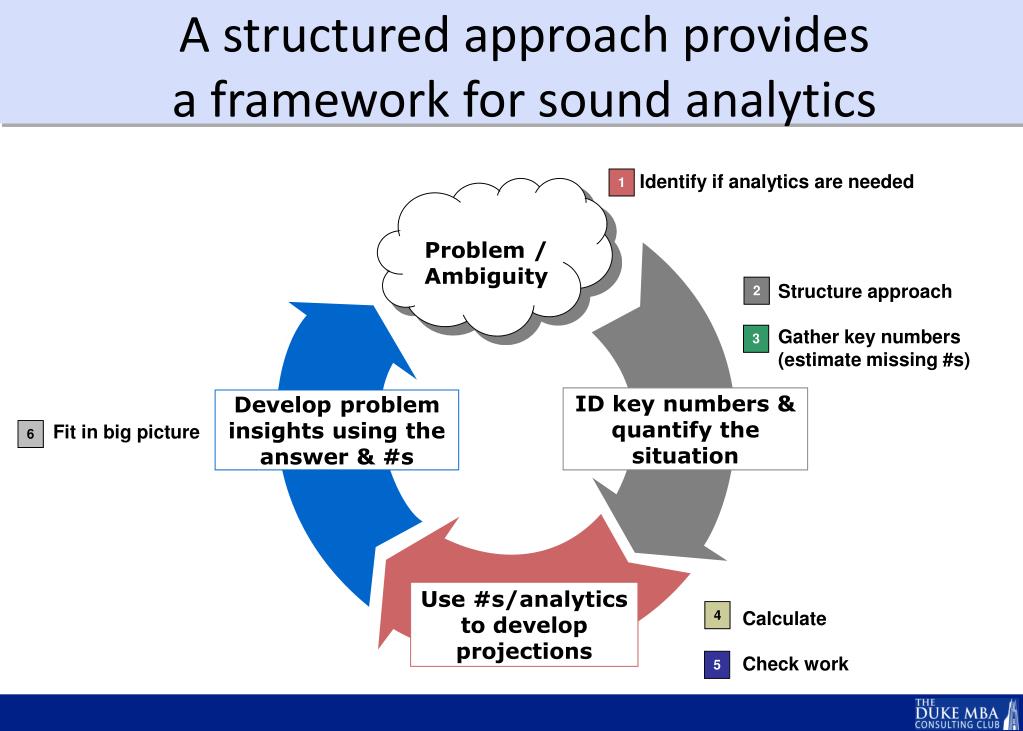 Like a case, the analytics should be structured 1 2 3 4 5 6 At no point should an interviewee go heads down or silent for more than 15-20 seconds. Analysis should be an interactive process