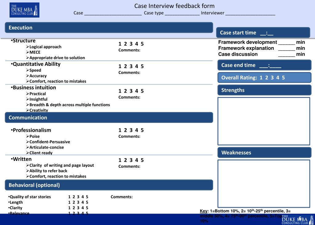 Case Interview feedback formCase _______________________ Case type ______________ Interviewer ____________________ Execution Case start time __:__ • Structure • Logical approach • MECE • Appropriate drive to solution • Quantitative Ability • Speed • Accuracy • Comfort, reaction to mistakes • Business intuition • Practical • Insightful • Breadth & depth across multiple functions • Creativity Framework development ______ min Framework explanation ______ min Case discussion ______ min • 1 2 3 4 5 • Comments: Case end time ___:____ • 1 2 3 4 5 • Comments: Overall Rating: 1 2 3 4 5 Strengths • 1 2 3 4 5 • Comments: Communication • Professionalism • Poise • Confident-Persuasive • Articulate-concise • Client ready • Written • Clarity of writing and page layout • Ability to refer back • Comfort, reaction to mistakes • 1 2 3 4 5 • Comments: Weaknesses • 1 2 3 4 5 • Comments: Behavioral (optional) • Quality of star stories 1 2 3 4 5 Comments: • Length 1 2 3 4 5 • Clarity 1 2 3 4 5 • Relevance 1 2 3 4 5 Key: 1=Bottom 10%, 2= 10th-25th percentile, 3= middle 50%, 4= 75th-90th percentile, 5=Top 10%
