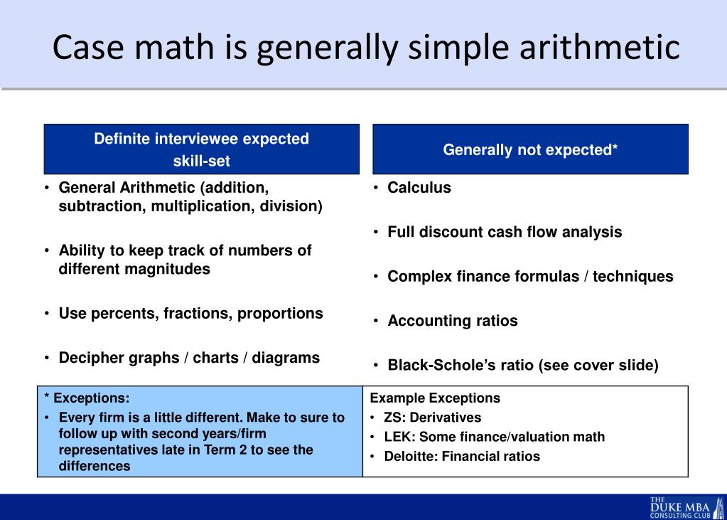 Case math is generally simple arithmetic Definite interviewee expected skill-set Generally not expected*