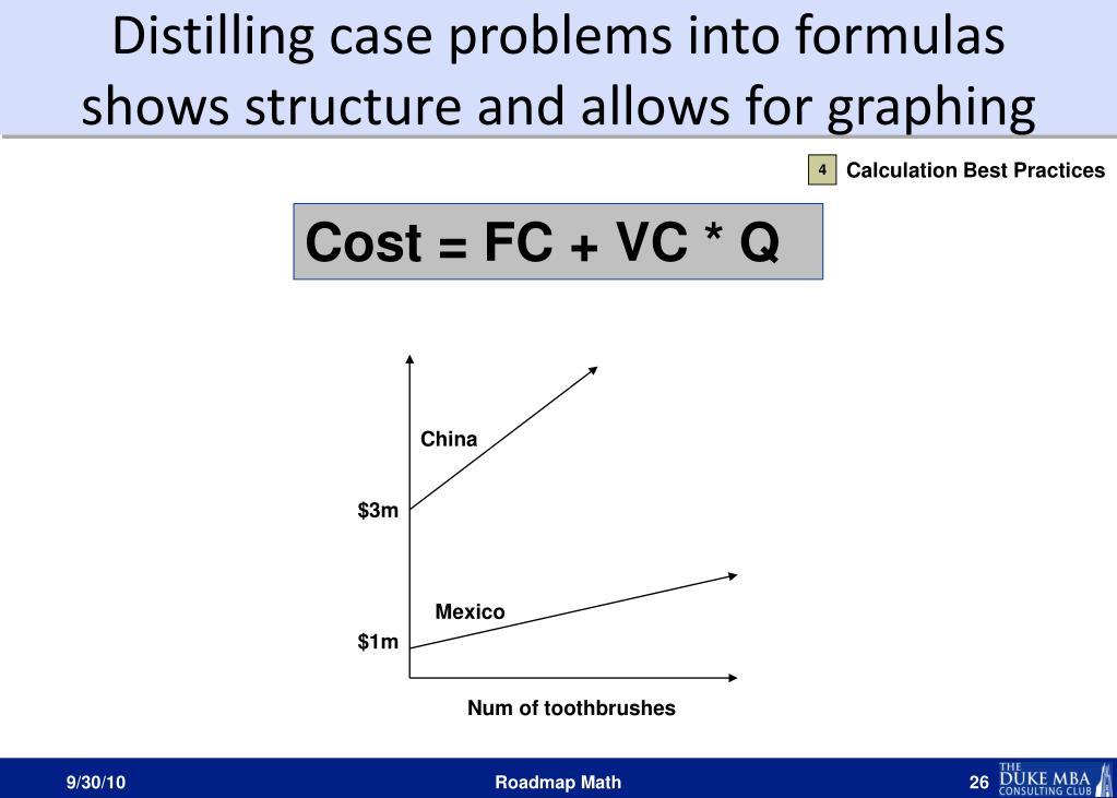 Distilling case problems into formulas shows structure and allows for graphing Calculation Best Practices 4 Cost = FC + VC * Q China $3m Mexico $1m Num of toothbrushes Roadmap Math