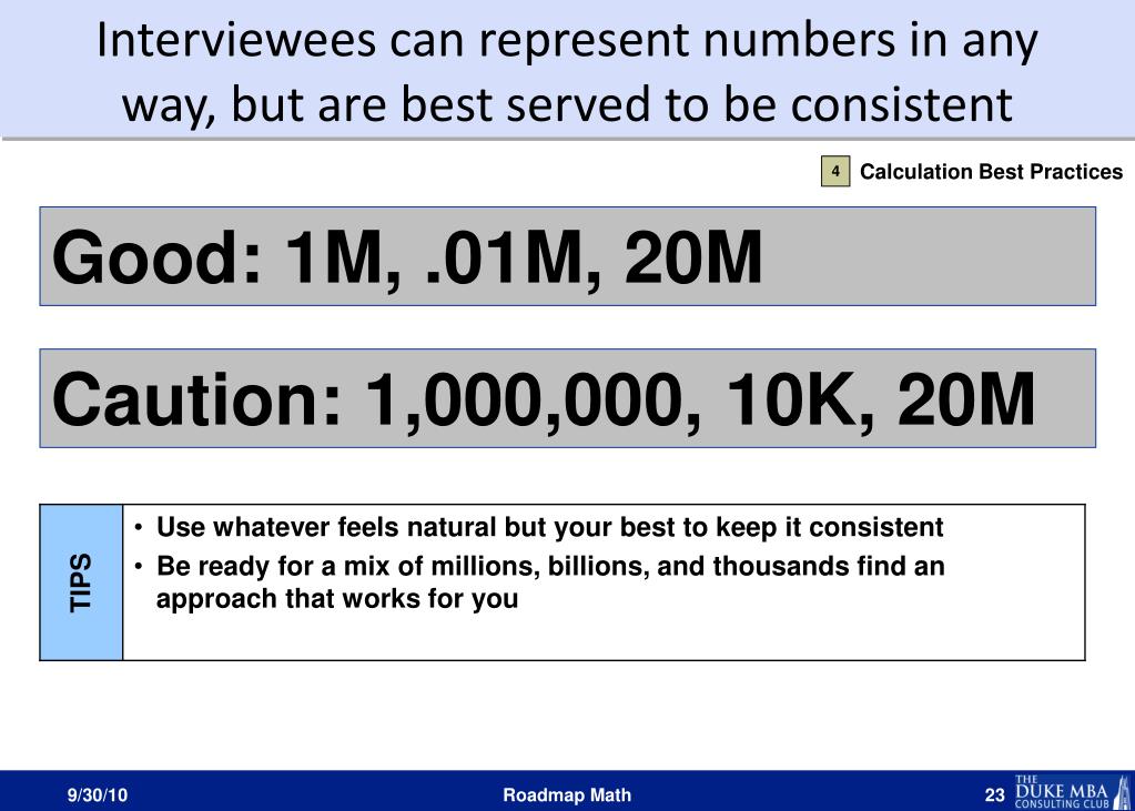 A structured math approach will help candidates of all analytical abilities Benefits for those who are “strong” at math Benefits for those who are “weak” at math A good practice for good “casing” is to always explain what you are going to do before you do it, and walk your interviewer what you’re doing every step of the way