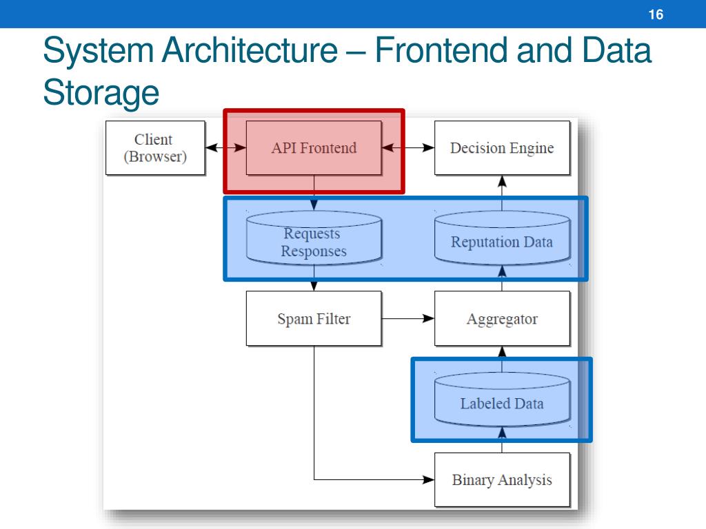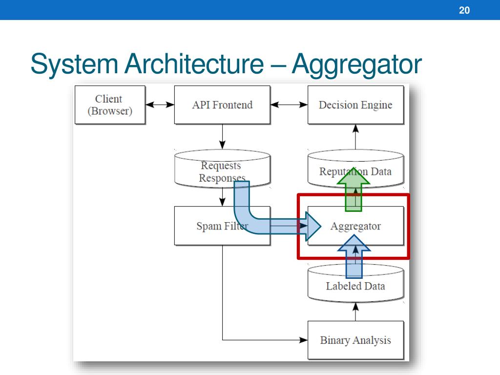 System Architecture – Aggregator • Aggregate • Forming the reputation data • 3-dimensional index • From where • Features • Categories: reputation / urls / hash • client | site:foo.com | reputation (6, 10) • analysis | ip:1.2.3.4/24 | urls (0, 3) • Value • (a, b) • a: the number of interesting observations • b: the total number of observations