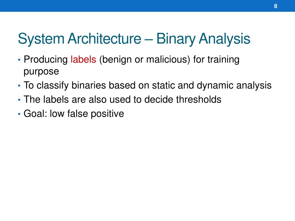 System Architecture – Binary Analysis • Producing labels (benign or malicious) for training purpose • To classify binaries based on static and dynamic analysis • The labels are also used to decide thresholds • Goal: low false positive