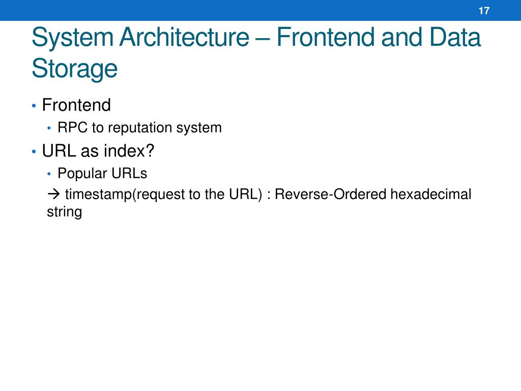 System Architecture – Frontend and Data Storage • Frontend • RPC to reputation system • URL as index? • Popular URLs timestamp(request to the URL) : Reverse-Ordered hexadecimal string