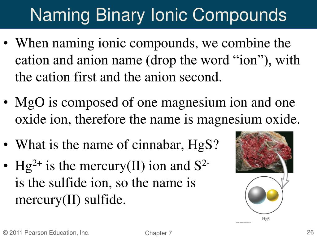 Naming Binary Ionic Compounds When naming ionic compounds, we combine the cation and anion name (drop the word “ion”), with the cation first and the anion second. MgO is composed of one magnesium ion and one oxide ion, therefore the name is magnesium oxide. What is the name of cinnabar, HgS? • Hg2+ is the mercury(II) ion and S2- is the sulfide ion, so the name is mercury(II) sulfide. Chapter 7
