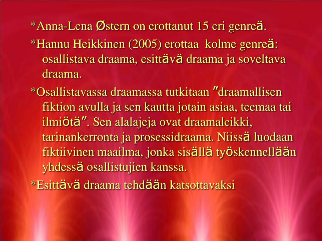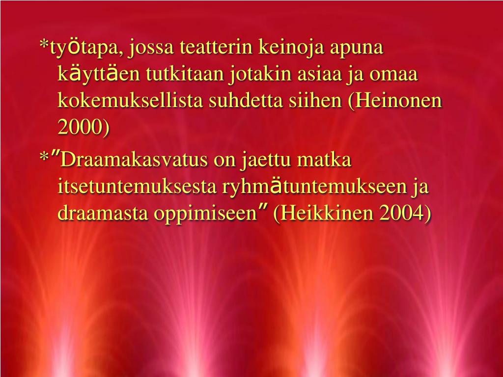* draama ja teatteri taidemuotona ja oppimismenetelmänä * draaman ja teatterin keinoja käytetään opetuksessa