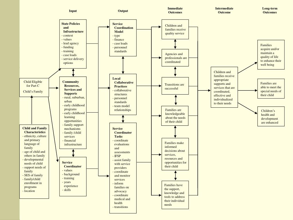 Long-term Outcomes Families acquire and/or maintain a quality of life to enhance their well being Families are able to meet the special needs of their child Children’s health and development are enhanced Families have the support, knowledge and tools to address their individual needs Families make informed decisions about services, resources and opportunities for their child Immediate Outcomes Intermediate Outcome Input Output • State Policies and Infrastructure • - context • values • lead agency • funding • training • case loads • - service delivery options • Service Coordination Model • type • finance • case loads • - personnel standards Children and families receive quality service Agencies and professionals are coordinated Children and families receive appropriate supports and services that are coordinated, effective and individualized to their needs • Local Collaborative Practices • collaborative structures • personnel standards • team model relationships Child Eligible for Part C Child’s Family • Community Resources, Services and Supports • rural, suburban, urban • early childhood programs • early childhood learning opportunities • family support mechanisms • family /child services • - financial infrastructure Transitions are successful Families are knowledgeable about the needs of their child • Child and Family Characteristics • - ethnicity, culture and primary language of family • - age of child and others in family • developmental needs of child • support needs of family • SES of family • - family/child enrollment in programs • - location • Service Coordinator Tasks • - coordinate evaluations and assessments • - IFSP • assist family with service providers • coordinate and monitor services • inform families on advocacy • coordinate medical and health • - transitions • Service Coordinator • - values • - background • - training • years experience • skills
