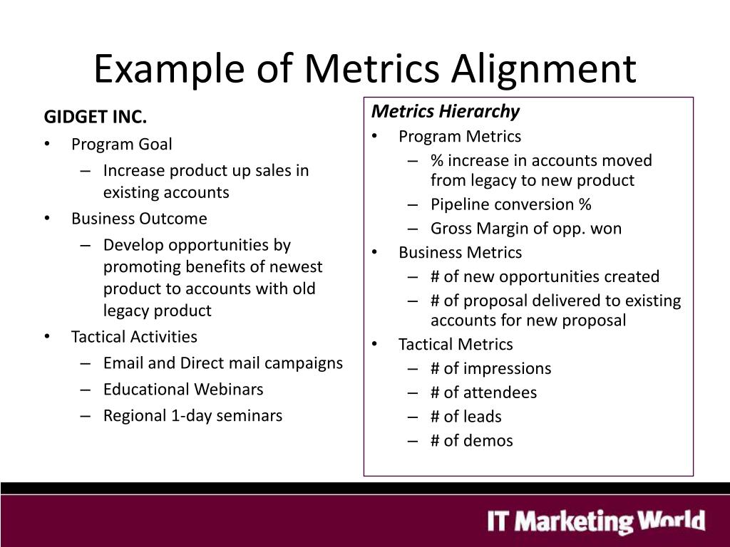 Example of Metrics Alignment GIDGET INC. Program Goal Increase product up sales in existing accounts Business Outcome Develop opportunities by promoting benefits of newest product to accounts with old legacy product Tactical Activities Email and Direct mail campaigns Educational Webinars Regional 1-day seminars Metrics Hierarchy Program Metrics % increase in accounts moved from legacy to new product Pipeline conversion % Gross Margin of opp. won Business Metrics # of new opportunities created # of proposal delivered to existing accounts for new proposal Tactical Metrics # of impressions # of attendees # of leads # of demos