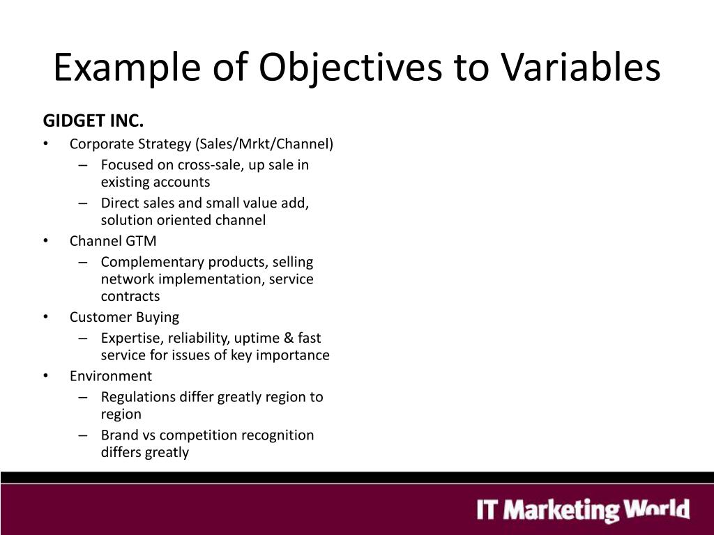 Example of Objectives to Variables GIDGET INC. Corporate Strategy (Sales/Mrkt/Channel) Focused on cross-sale, up sale in existing accounts Direct sales and small value add, solution oriented channel Channel GTM Complementary products, selling network implementation, service contracts Customer Buying Expertise, reliability, uptime & fast service for issues of key importance Environment Regulations differ greatly region to region Brand vs competition recognition differs greatly