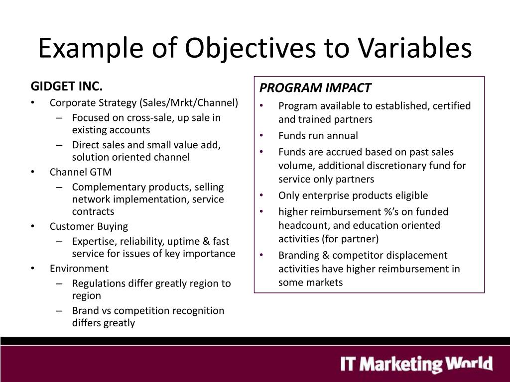 Example of Objectives to Variables GIDGET INC. Corporate Strategy (Sales/Mrkt/Channel) Focused on cross-sale, up sale in existing accounts Direct sales and small value add, solution oriented channel Channel GTM Complementary products, selling network implementation, service contracts Customer Buying Expertise, reliability, uptime & fast service for issues of key importance Environment Regulations differ greatly region to region Brand vs competition recognition differs greatly • PROGRAM IMPACT • Program available to established, certified and trained partners • Funds run annual • Funds are accrued based on past sales volume, additional discretionary fund for service only partners • Only enterprise products eligible • higher reimbursement %’s on funded headcount, and education oriented activities (for partner) • Branding & competitor displacement activities have higher reimbursement in some markets