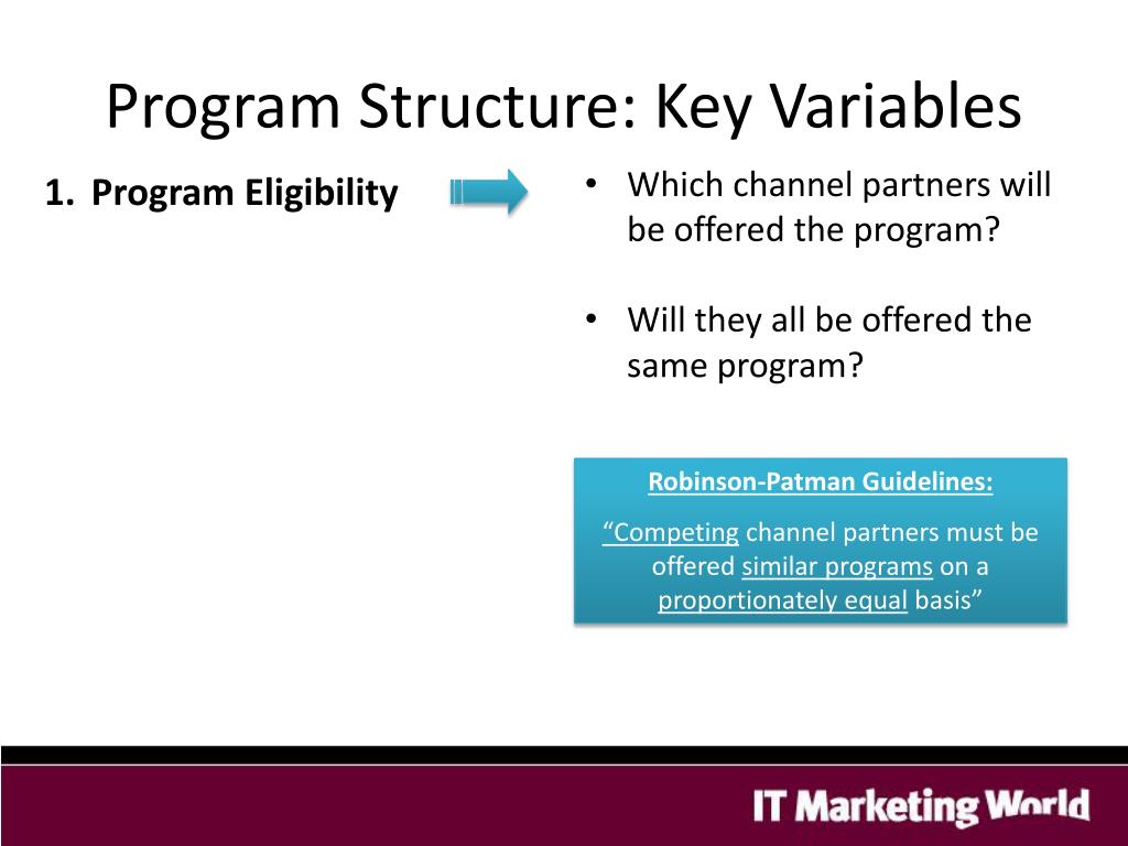 Program Eligibility Which channel partners will be offered the program? Will they all be offered the same program? Program Structure: Key Variables Robinson-Patman Guidelines: “Competing channel partners must be offered similar programs on a proportionately equal basis”