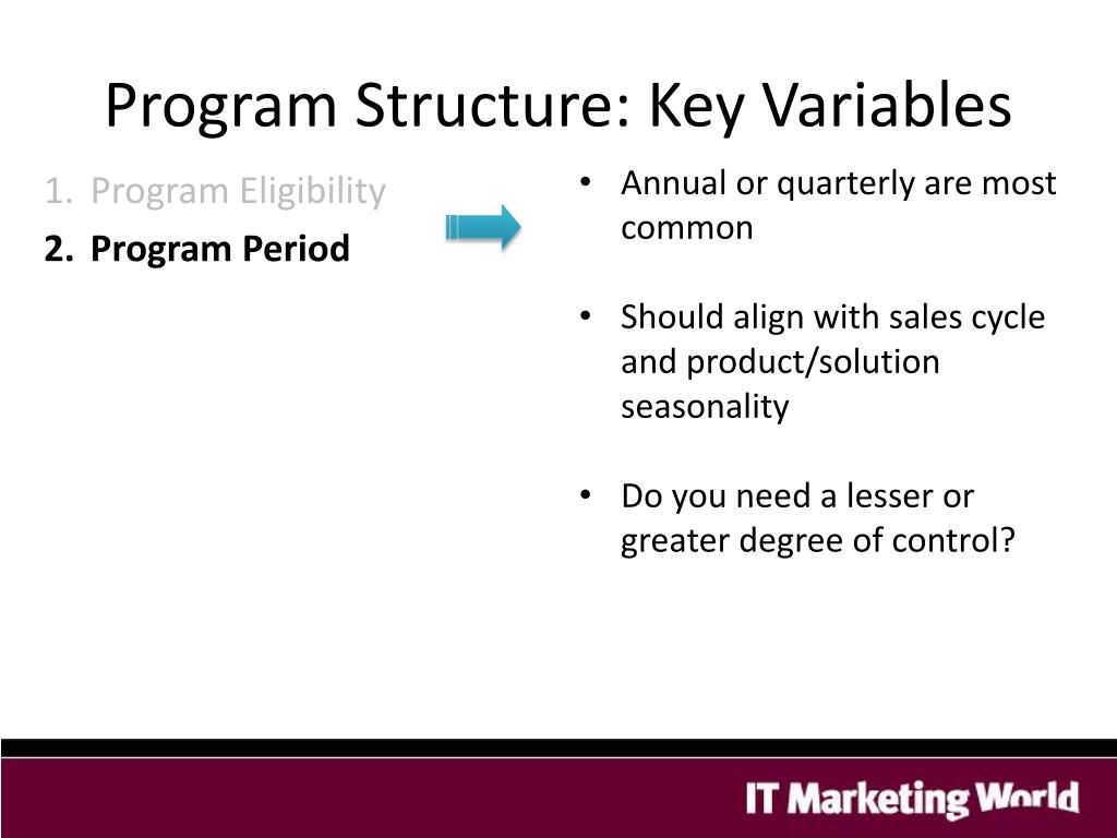 Program Eligibility Program Period Annual or quarterly are most common Should align with sales cycle and product/solution seasonality Do you need a lesser or greater degree of control? Program Structure: Key Variables