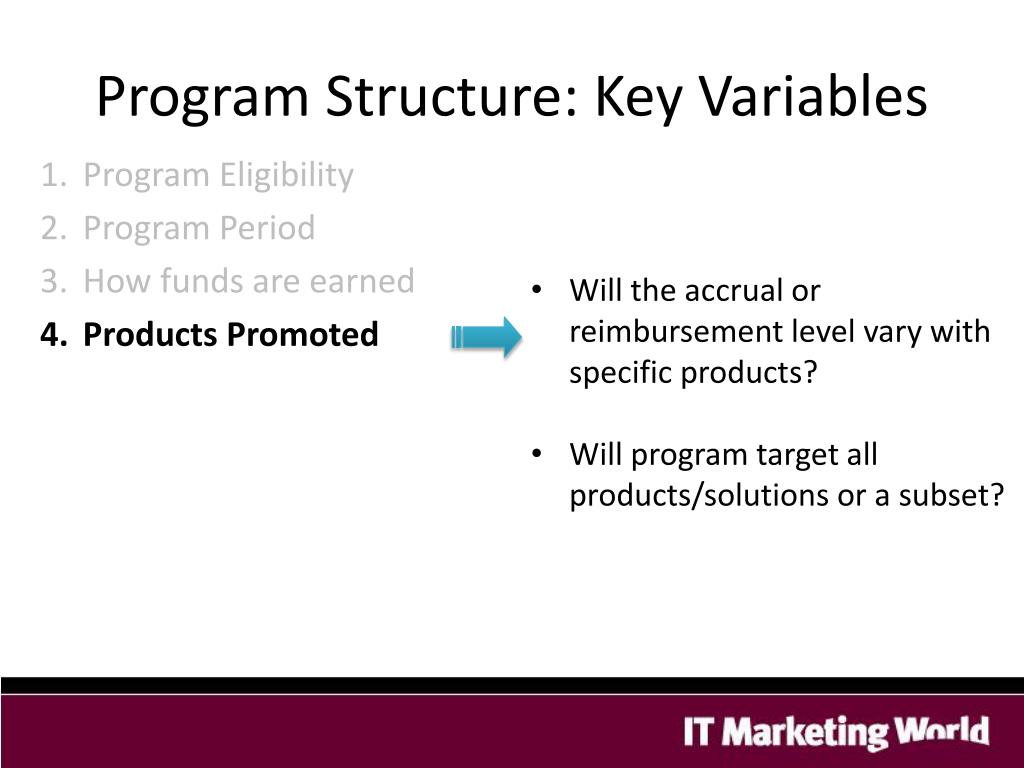 Program Eligibility Program Period How funds are earned Products Promoted Will the accrual or reimbursement level vary with specific products? Will program target all products/solutions or a subset? Program Structure: Key Variables