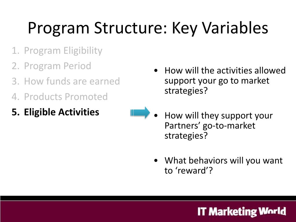 Program Eligibility Program Period How funds are earned Products Promoted Eligible Activities Program Structure: Key Variables • How will the activities allowed support your go to market strategies? • How will they support your Partners’ go-to-market strategies? • What behaviors will you want to ‘reward’?