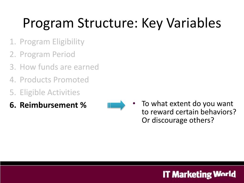 Program Eligibility Program Period How funds are earned Products Promoted Eligible Activities Reimbursement % Program Structure: Key Variables • To what extent do you want to reward certain behaviors? Or discourage others?
