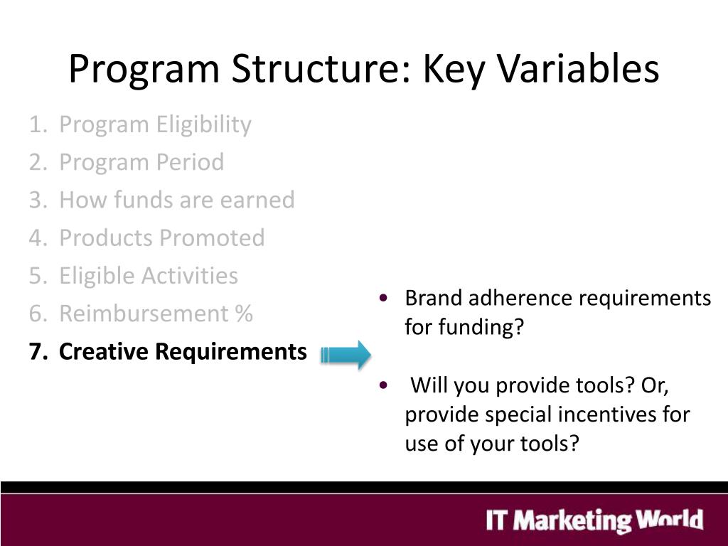 Program Eligibility Program Period How funds are earned Products Promoted Eligible Activities Reimbursement % Creative Requirements Program Structure: Key Variables • Brand adherence requirements for funding? • Will you provide tools? Or, provide special incentives for use of your tools?