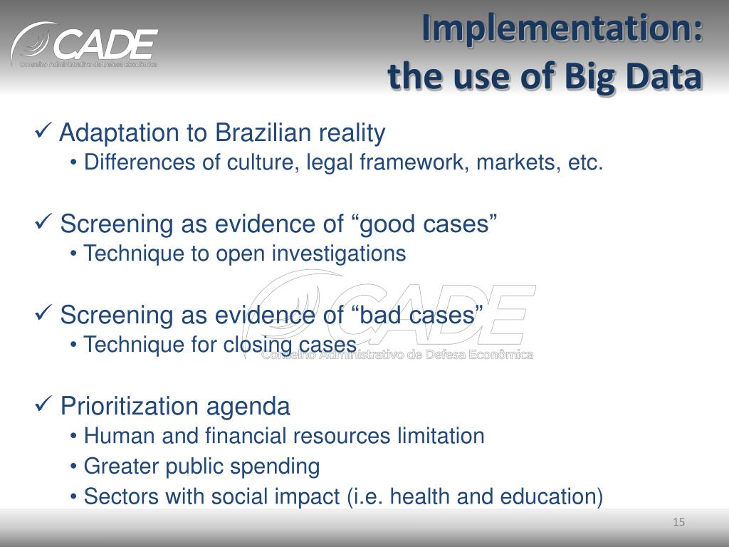Implementation:the use of Big Data • Adaptation to Brazilian reality • Differencesofculture, legal framework, markets, etc. • Screening as evidence of “good cases” • Technique to open investigations • Screening as evidence of “bad cases” • Technique for closing cases • Prioritization agenda • Human and financial resources limitation • Greater public spending • Sectors with social impact (i.e. health and education)