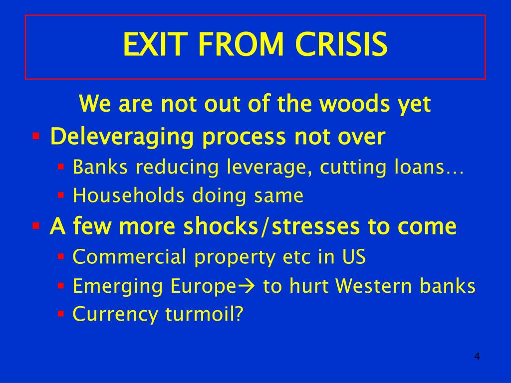 EXIT FROM CRISIS We are not out of the woods yet • Deleveraging process not over • Banks reducing leverage, cutting loans… • Households doing same • A few more shocks/stresses to come • Commercial property etc in US • Emerging Europe to hurt Western banks • Currency turmoil?