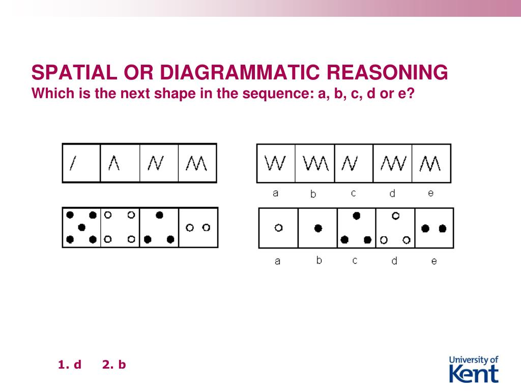 SPATIAL OR DIAGRAMMATIC REASONINGWhich is the next shape in the sequence: a, b, c, d or e? 1. d 2. b