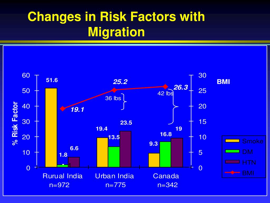 Evolution of risk factors in South Asians 2. pre-Diabetes 3. Diabetes 4. Heart Disease 1.Weight gain • Lipids • Blood Pressure 5.?Some Cancers 6