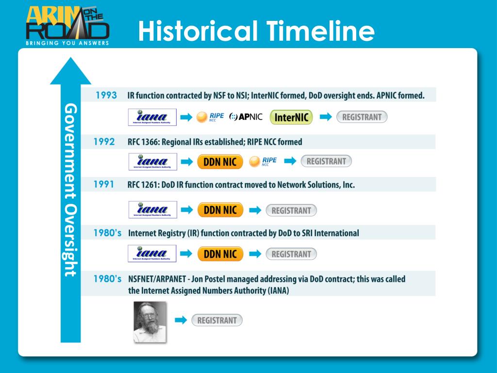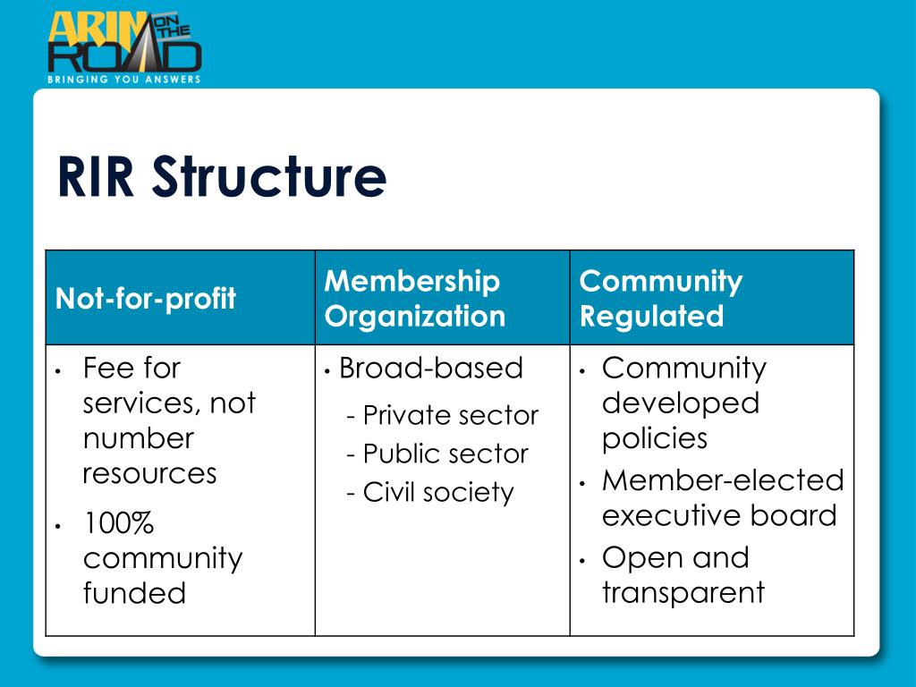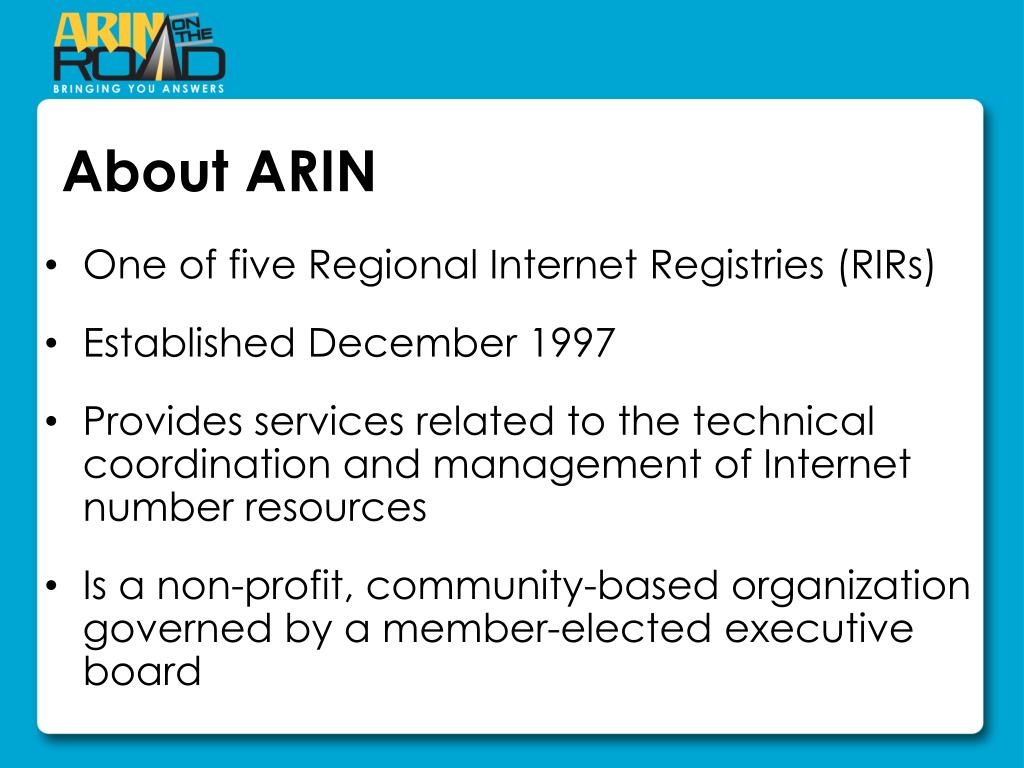 About ARIN • One of five Regional Internet Registries (RIRs) • Established December 1997 • Provides services related to the technical coordination and management of Internet number resources • Is a non-profit, community-based organization governed by a member-elected executive board