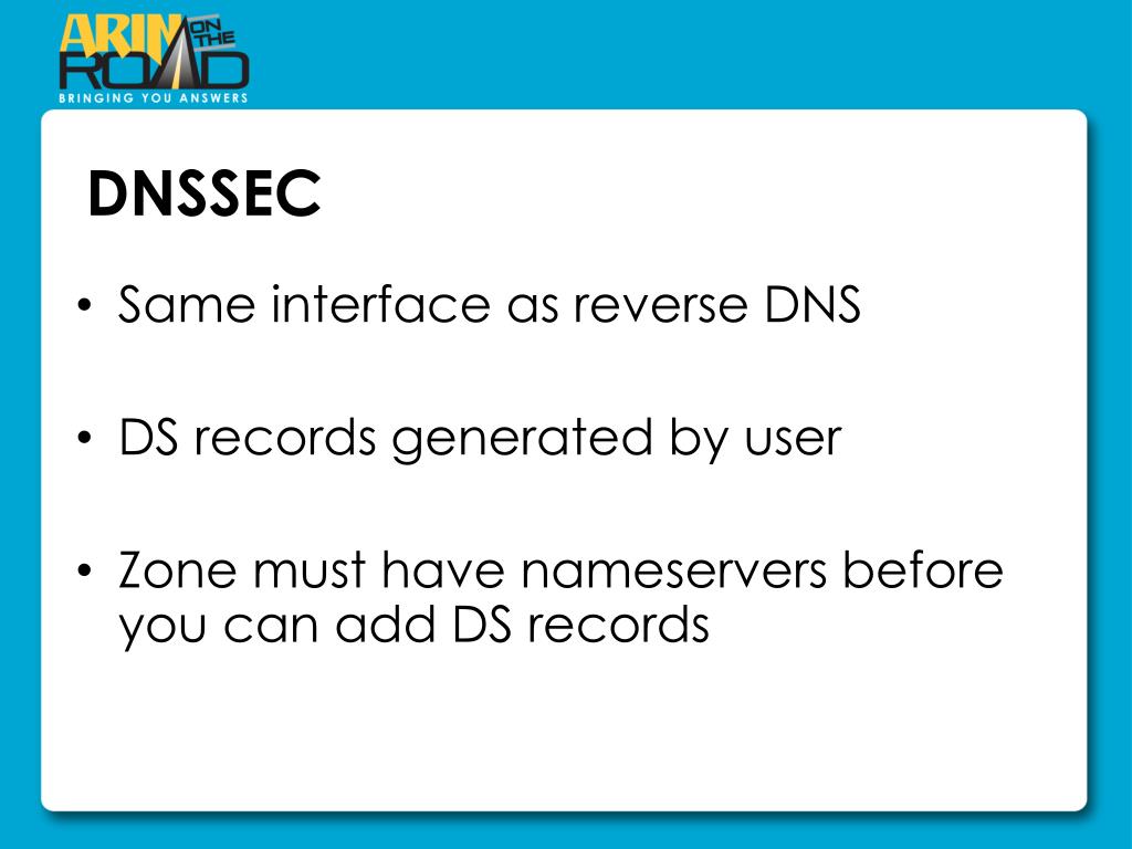DNSSEC • Same interface as reverse DNS • DS records generated by user • Zone must have nameservers before you can add DS records